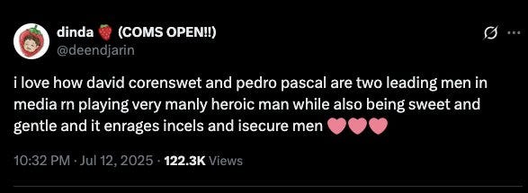 This is more about how people talk about people like Pedro Pascal. How people are stuck on Stage 3 of Gelfer’s Stages of Masculinity called “Critical Masculinity” and how silly it is how we haven’t moved past it, especially after it’s bitten us in the butt before (and frankly not too long ago).