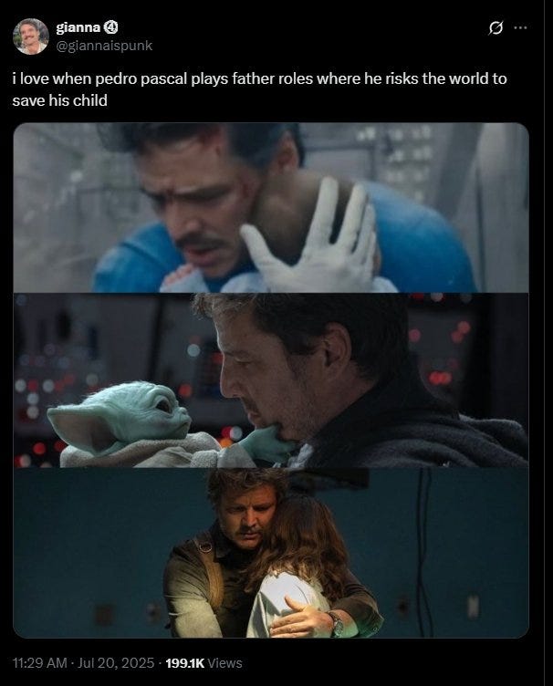 A few months have passed and we as a society have collectively decided that we have crowned a new “Good Man” and his name is Pedro Pascal. The Chilean born, American raised actor has three movies out this year (‘Materialists’ 1the new movie by Celine Song, ‘Eddington’ the new movie by Ari Aster2, and the a high profile MCU movie “Fantastic Four: First Steps”3) plus a high profile TV show (the just ended second season of HBO’s “The Last of Us”4), so it seems like a good time like any for us as a collective to shine a spot light on him.